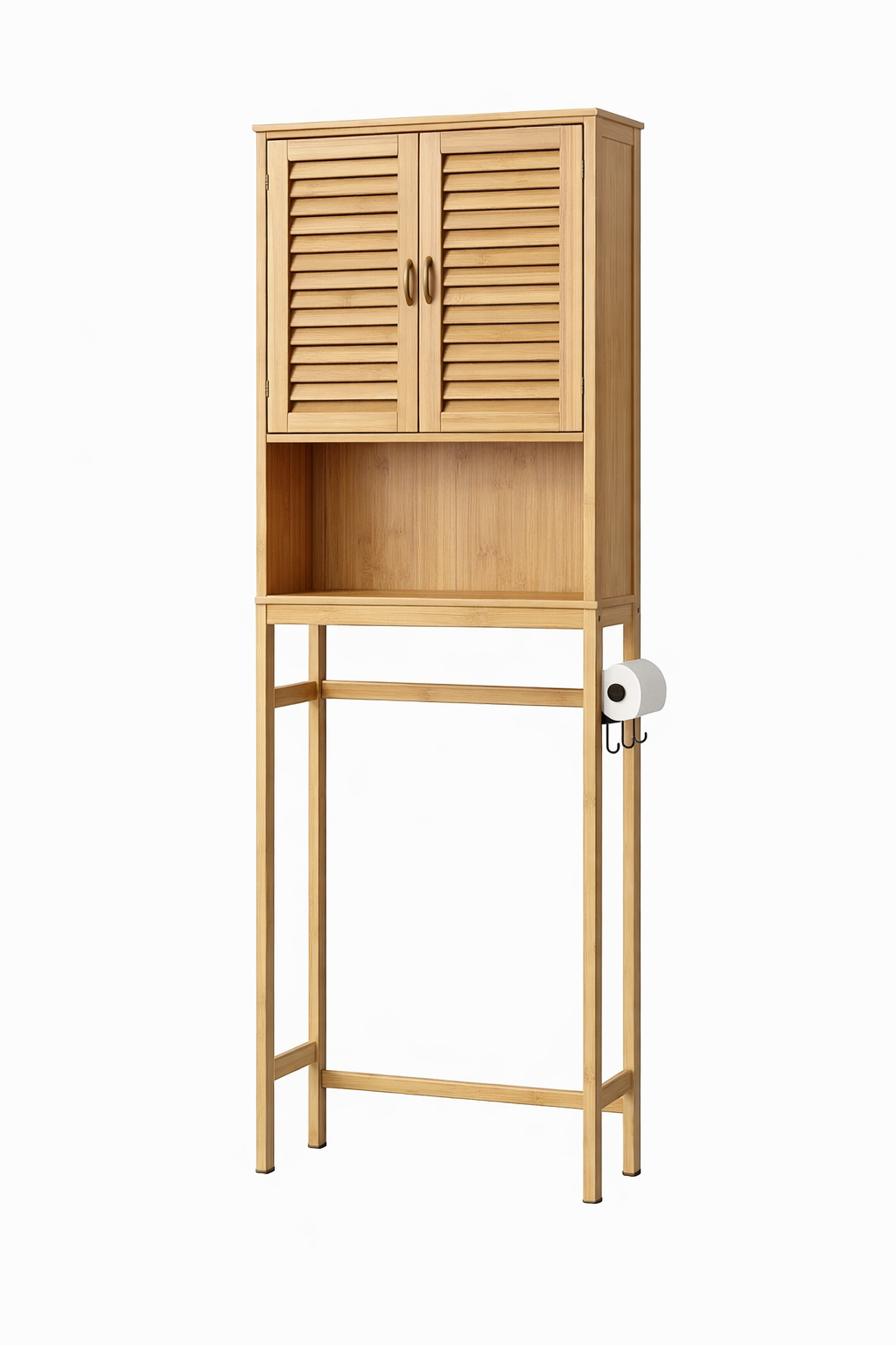 Bring warmth, function, and smart organization to your bathroom with this bamboo over-the-toilet storage cabinet. Crafted from high-quality natural bamboo with a light wood finish, this freestanding unit is designed to fit over most standard toilets while maximizing vertical space. A closed cabinet with hollow-carved doors keeps personal items protected from dust and moisture, while the open middle shelf provides quick access to everyday essentials such as towels and toiletries. The removable interior shelf offers flexible storage for taller items, and the naturally moisture-resistant bamboo construction makes it ideal for humid bathroom environments. Finished with a clean, modern look and an anti-tip safety design, this cabinet adds both elegance and practical storage to small bathrooms without sacrificing floor space.