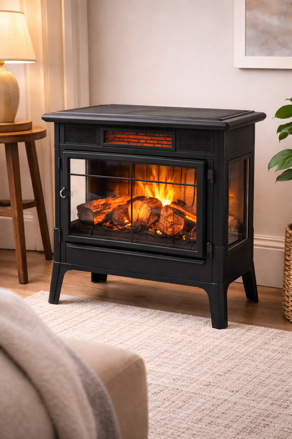 Crafted with durable metal construction, side-viewing windows, and an operable beveled-glass door, this freestanding electric stove blends classic style with modern performance. The adjustable digital thermostat, overheat protection, and included remote control ensure safe and convenient operation. Perfect for living rooms, bedrooms, cabins, or apartments, this electric fireplace heater adds both cozy comfort and timeless charm.