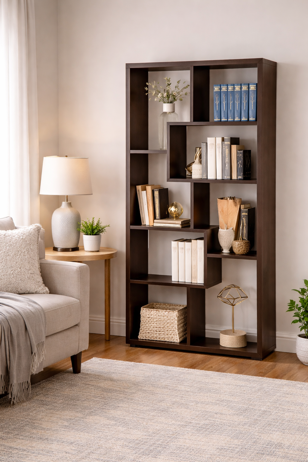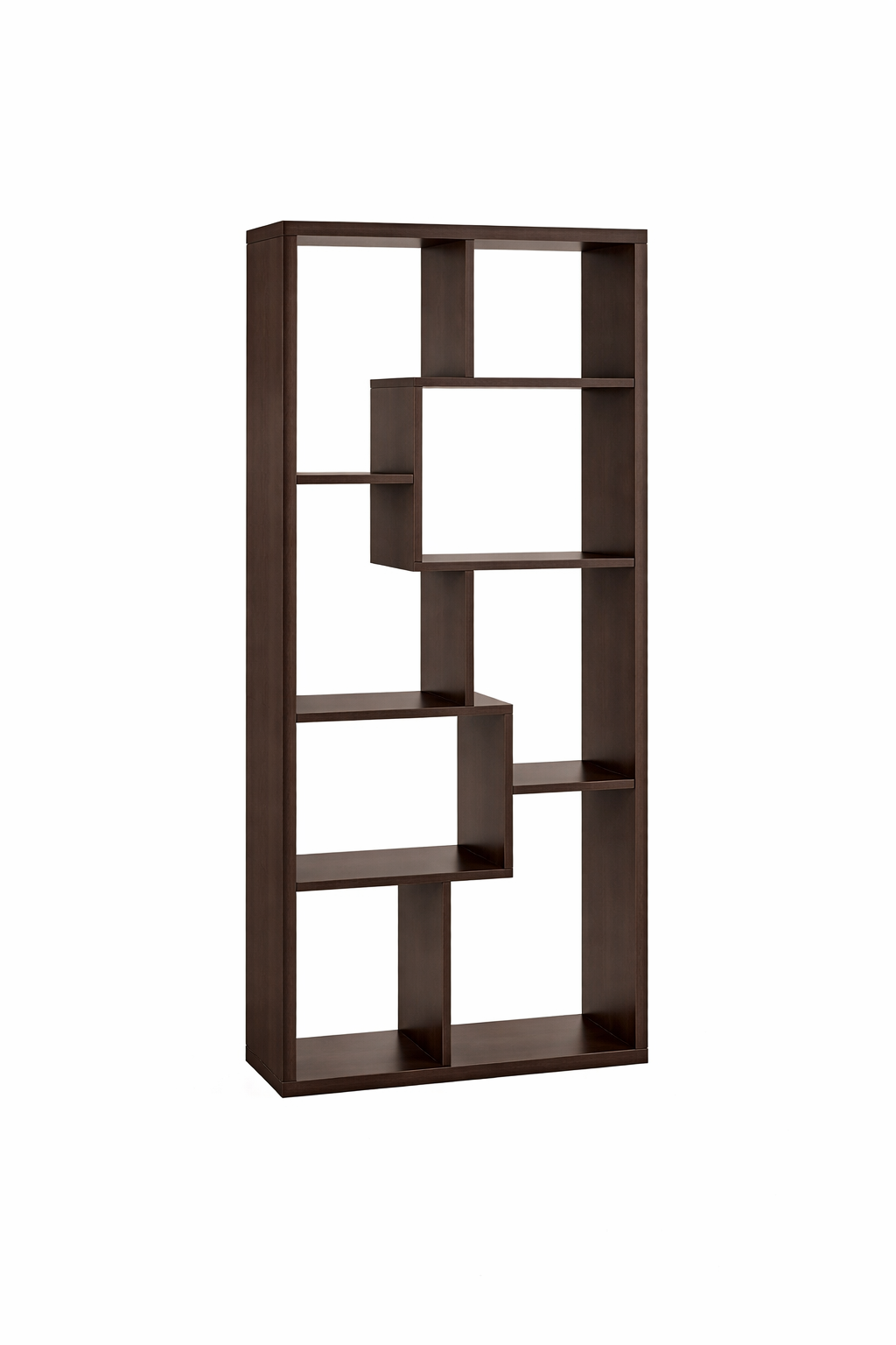 Add dimension and contemporary flair to your space with this modern cube bookcase in a rich cappuccino finish. Designed with an eye-catching asymmetrical layout, the interlocking shelves create a dynamic visual statement while offering multiple compartments for both storage and display. The varied cube sizes are perfect for organizing books, décor, framed photos, and collectibles, making it as functional as it is stylish. Its slim profile fits easily against walls in living rooms, bedrooms, home offices, or entryways, while the deep cappuccino tone brings warmth and sophistication that complements modern, transitional, or minimalist décor. Durable and versatile, this bookcase doubles as a statement display piece that keeps your space neat and beautifully styled.