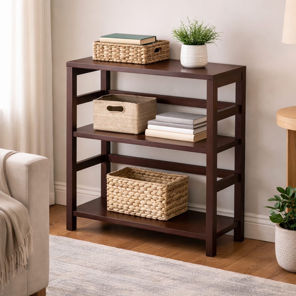 Clean lines and versatile storage make this contemporary 3-tier bookcase an easy addition to any room in your home. Finished in a rich espresso wood tone, the streamlined silhouette brings a modern, polished look while offering practical space for books, décor, and everyday essentials. Three open shelves provide flexible organization, with two sections perfectly sized to accommodate coordinating storage baskets for a tidy, customized setup. Its compact footprint makes it ideal for living rooms, bedrooms, offices, or entryways, whether used alone or combined with matching shelves to create a larger wall unit. Simple, sturdy, and adaptable, this piece delivers stylish storage that blends seamlessly with modern and transitional décor.