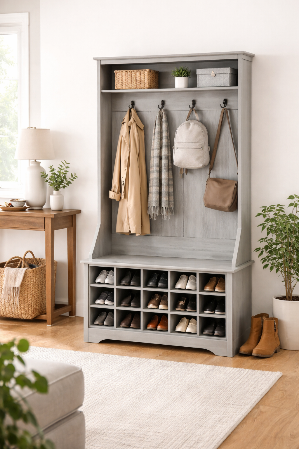 Gray Entryway Hall Tree with Shoe Cubbies & Coat Hooks