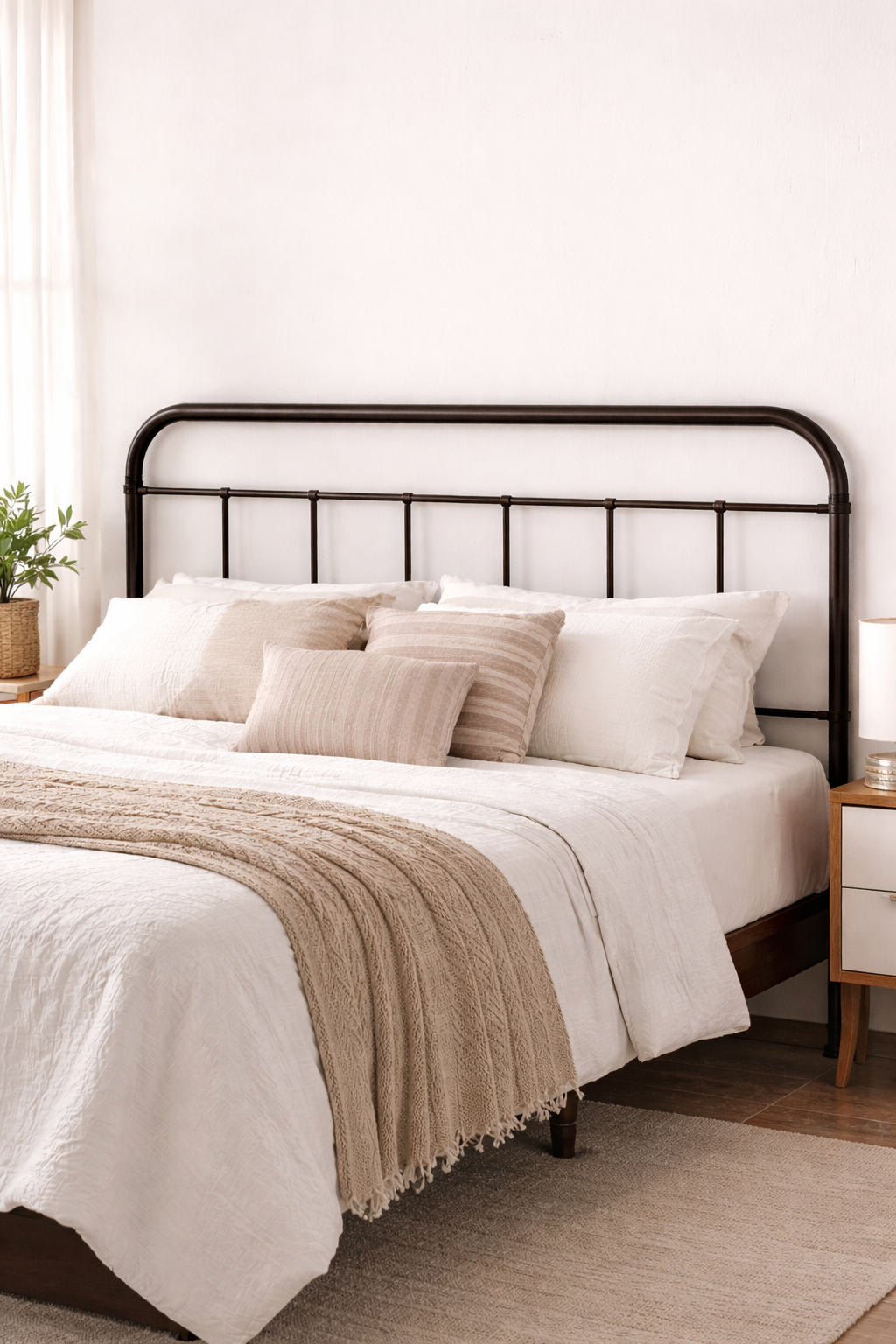Add timeless character to your bedroom with this King Steel Headboard in a vintage dark brown finish. Crafted from durable steel metal with a powder-coated antique look, this king-size metal headboard blends rustic charm with clean, modern lines. The softly rounded corners and vertical spindle detailing create a refined farmhouse aesthetic that complements cottage, traditional, and modern farmhouse interiors. A reinforced center ladder beam enhances structural stability, while non-marking foot caps help protect hardwood and tile flooring. Designed to anchor master bedrooms or guest spaces with understated elegance, this vintage-inspired metal headboard delivers dependable construction and classic style in one versatile statement piece.
