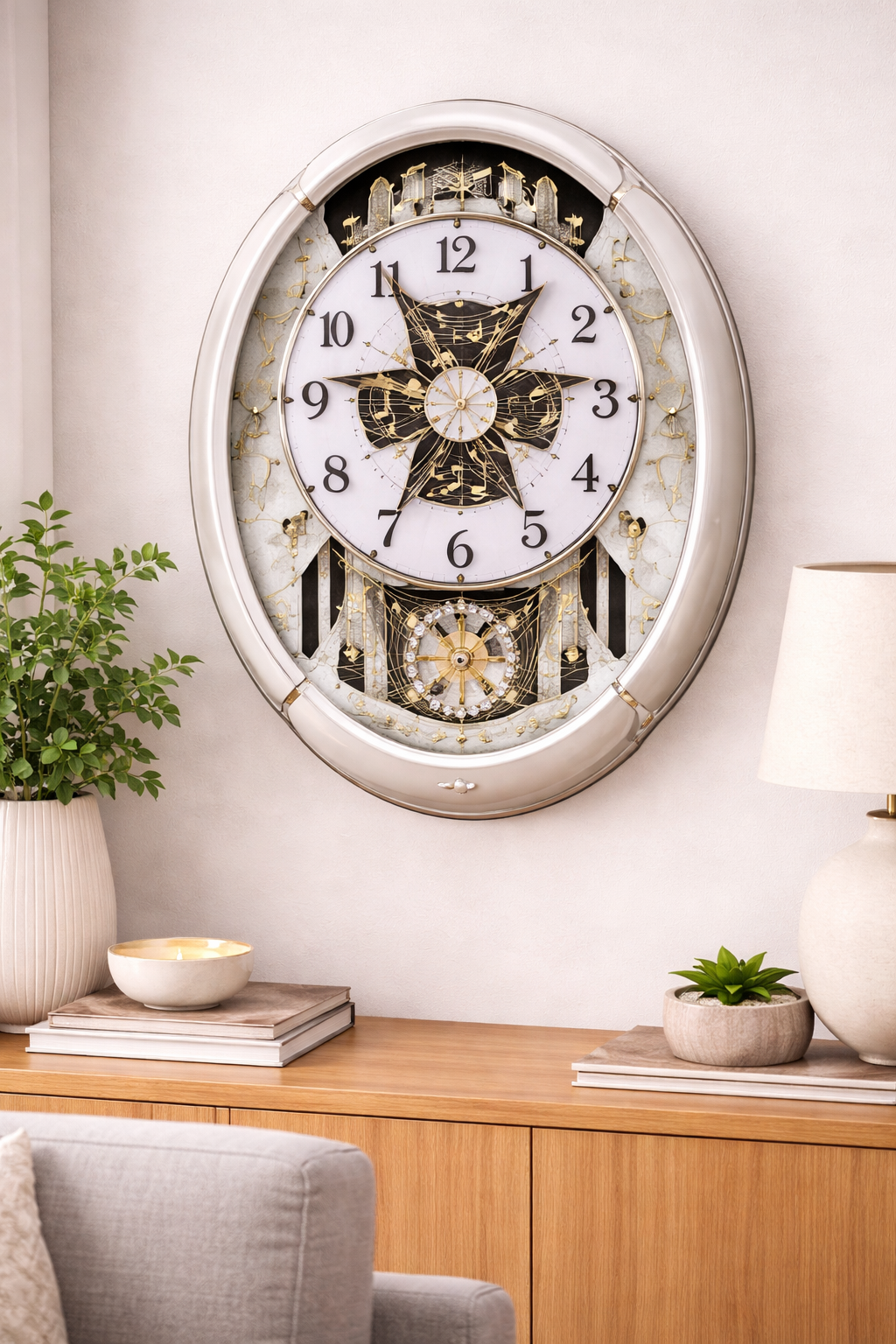 Make a bold statement in your home with this Moving Face Pendulum Wall Clock that plays melodies every hour. Designed to captivate and entertain, this unique wall clock features an animated dial that dramatically breaks into six sections on the hour, revealing rotating musical notes and charming guitar details beneath. A decorative pendulum accented with colorful stones rotates continuously, adding motion and visual interest throughout the day. Finished in a sleek silver tone with a traditional round silhouette, this clock blends classic style with playful innovation. Powered by reliable quartz movement and equipped with hourly musical chimes, it’s an eye-catching accent piece perfect for living rooms, family rooms, or entertainment spaces.