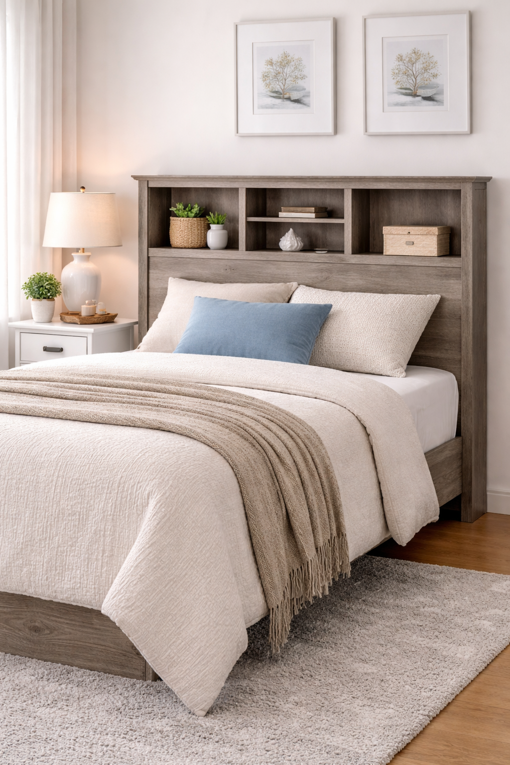 Bring functional style to your bedroom with this Full / Queen Freestanding Bookcase Headboard in a versatile Grey Brown wood finish. Designed to offer generous storage without overwhelming your space, this headboard features three open storage compartments and an adjustable center shelf, perfect for books, décor, alarm clocks, or everyday essentials. The freestanding design makes it compatible with both full and queen beds while eliminating the need for wall mounting, giving you flexible placement in bedrooms of any size. Finished in a drifted gray laminate, this piece blends coastal charm with clean modern lines, making it an easy fit for farmhouse, coastal, or contemporary interiors. Constructed from CARB-compliant composite wood and proudly manufactured in Canada, it delivers durable performance with a compact footprint and simple assembly.