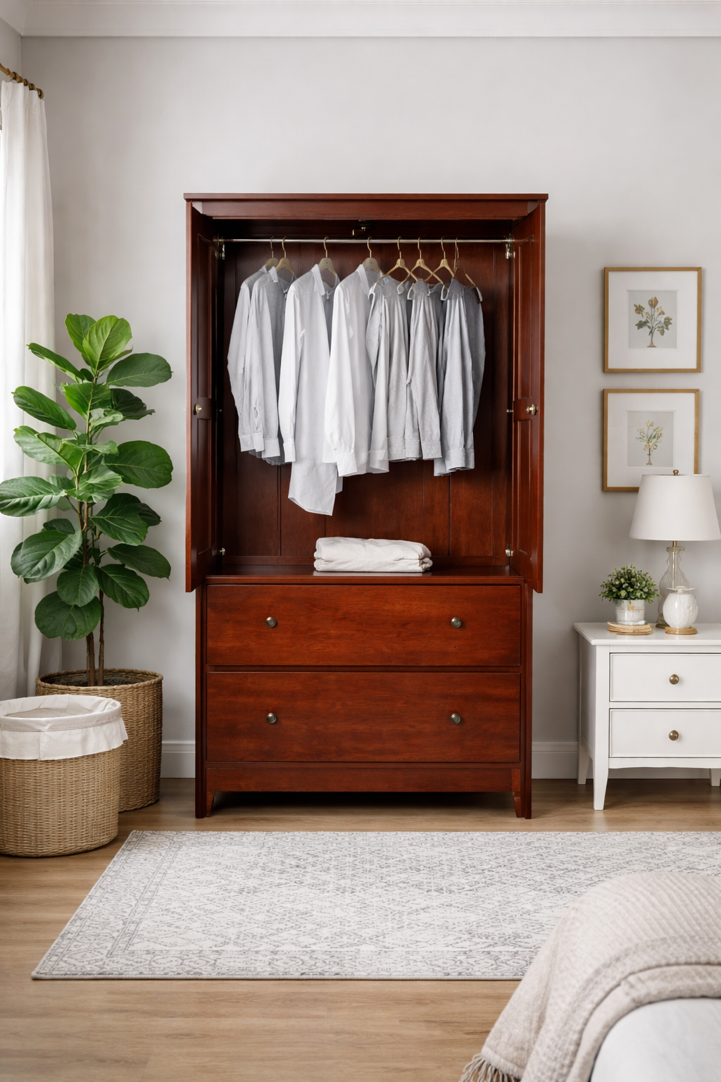 Add timeless storage and refined character to your bedroom with this Solid Wood Bedroom Armoire Wardrobe Cabinet with Hanging Bar in Cherry Finish. Crafted from 100% solid pine and built with durable blockboard construction, this Shaker-style armoire delivers both strength and elegance. The rich cherry finish, attractive metal knobs, and clean-lined design create a classic look that complements traditional, transitional, and farmhouse interiors.