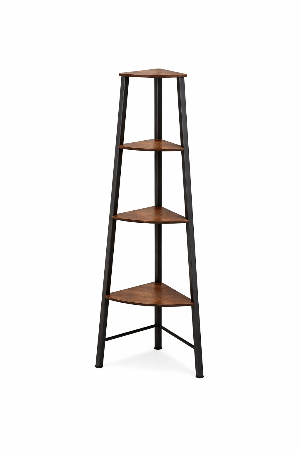 Maximize unused corner space with this narrow industrial-style corner shelving unit designed to add both storage and character to any room. The matte-black metal frame pairs beautifully with vintage-brown wood shelves, creating a warm, rustic look that complements farmhouse, loft, and modern interiors alike. Four open, fan-shaped tiers provide the perfect spot to display plants, books, décor accents, or everyday essentials while keeping everything neatly organized and within reach. Built from durable chipboard and reinforced iron, the sturdy three-legged structure includes protective feet and anti-tip hardware for dependable stability, making it ideal for living rooms, bedrooms, offices, bathrooms, or balconies. Compact yet functional, this vertical design helps you make the most of tight spaces without sacrificing style.
