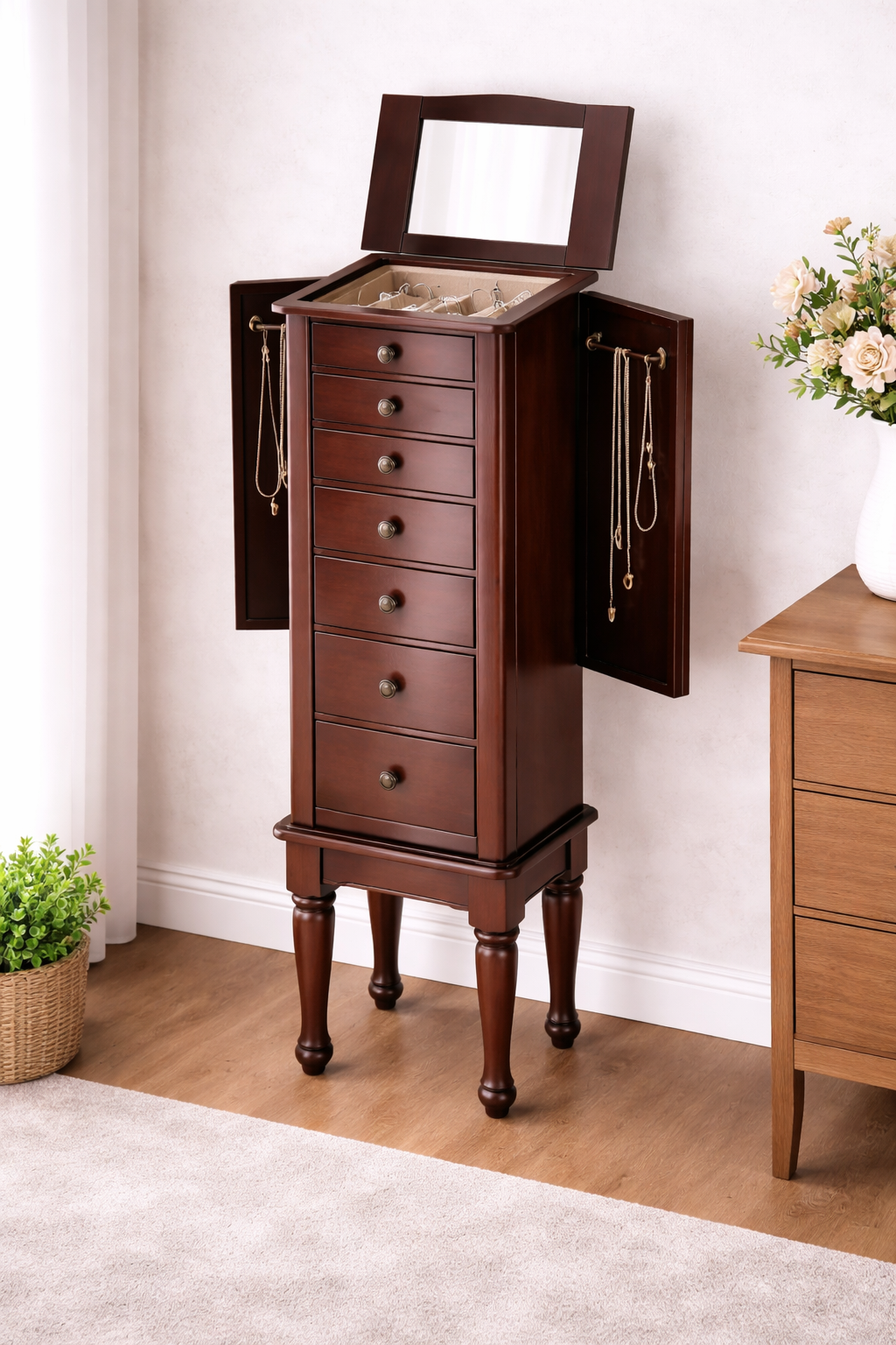 The lift-top lid opens to reveal a built-in mirror and divided compartments for rings, earrings, and small accessories. Seven spacious drawers provide ample room for bracelets, watches, scarves, perfumes, and more, while two swing-out side doors feature multiple hooks to safely hang necklaces and long earrings. Raised on a tall stand to help protect jewelry from moisture, this wood jewelry armoire blends classic design with everyday functionality for long-lasting use.