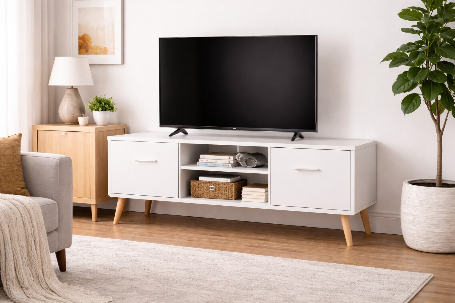 Bring timeless style and practical storage to your living space with this mid-century modern white TV stand. Designed with clean lines and natural wood legs, this media console blends classic mid-century charm with modern functionality, making it a perfect fit for living rooms, bedrooms, or apartments.