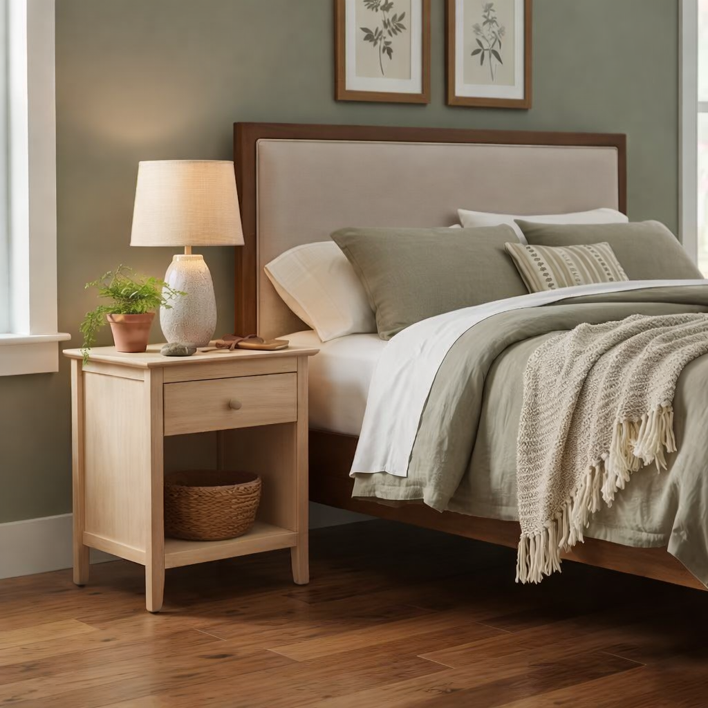 Simple, clean, and effortlessly versatile, this natural-wood bedside nightstand adds a warm tone and practical storage to any bedroom. Crafted from a durable blend of solid and composite wood, the light natural finish highlights the wood grain while blending seamlessly with modern, Scandinavian, farmhouse, or transitional décor. The smooth-gliding top drawer keeps essentials like glasses, chargers, or books within easy reach, while the enclosed lower cabinet provides concealed storage for larger items to help maintain a tidy space. A satin nickel knob adds a subtle modern accent, and the compact, lightweight design makes it easy to move and position wherever needed. Functional, sturdy, and easy to maintain, this bedside table is a smart everyday storage solution for bedrooms, guest rooms, or small spaces.